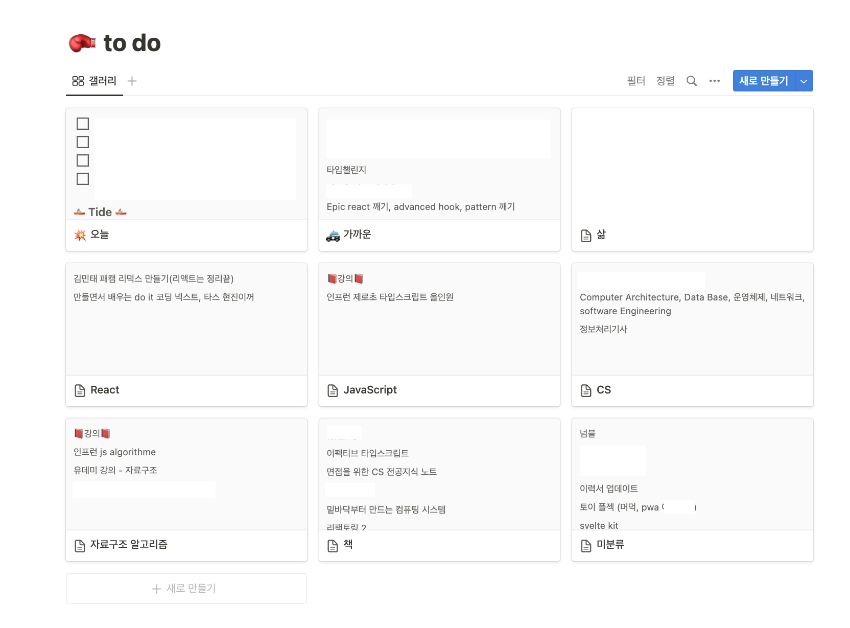 이전 버전에서는 카테고리별로 강의, 책 공부해보고 싶은 주제들 잔뜩 한눈에 보이게 정리해 뒀다.