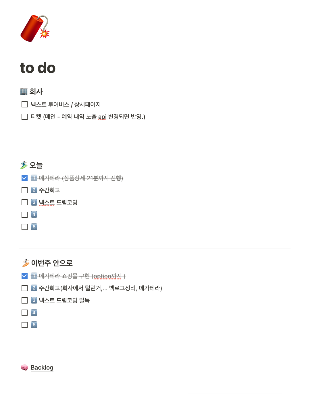 개인 분류는 오늘 무조건 할 일, 일주일 내로 할 일, 다 없애버리고 싶은 Backlog로 분류되고 각 각 5개를 넘지 않는다.
